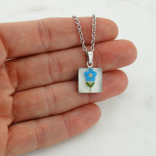 - A real mini Forget Me Not flower is preserved in resin and inset in stainless steel